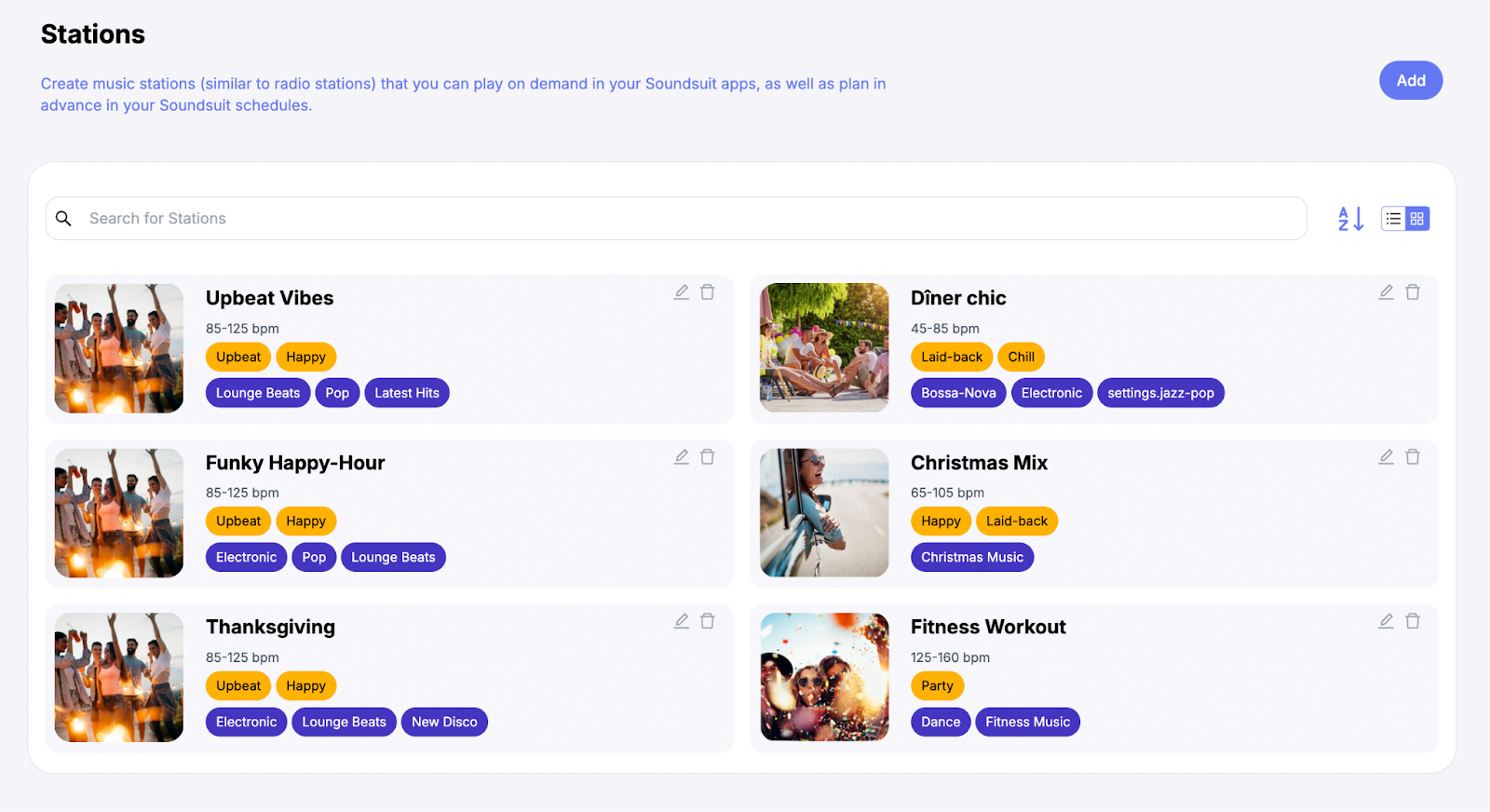 1.4. Add new stations to the ones automatically generated for you based on your integration on the Soundsuit web app. Or delete any unnecessary stations.