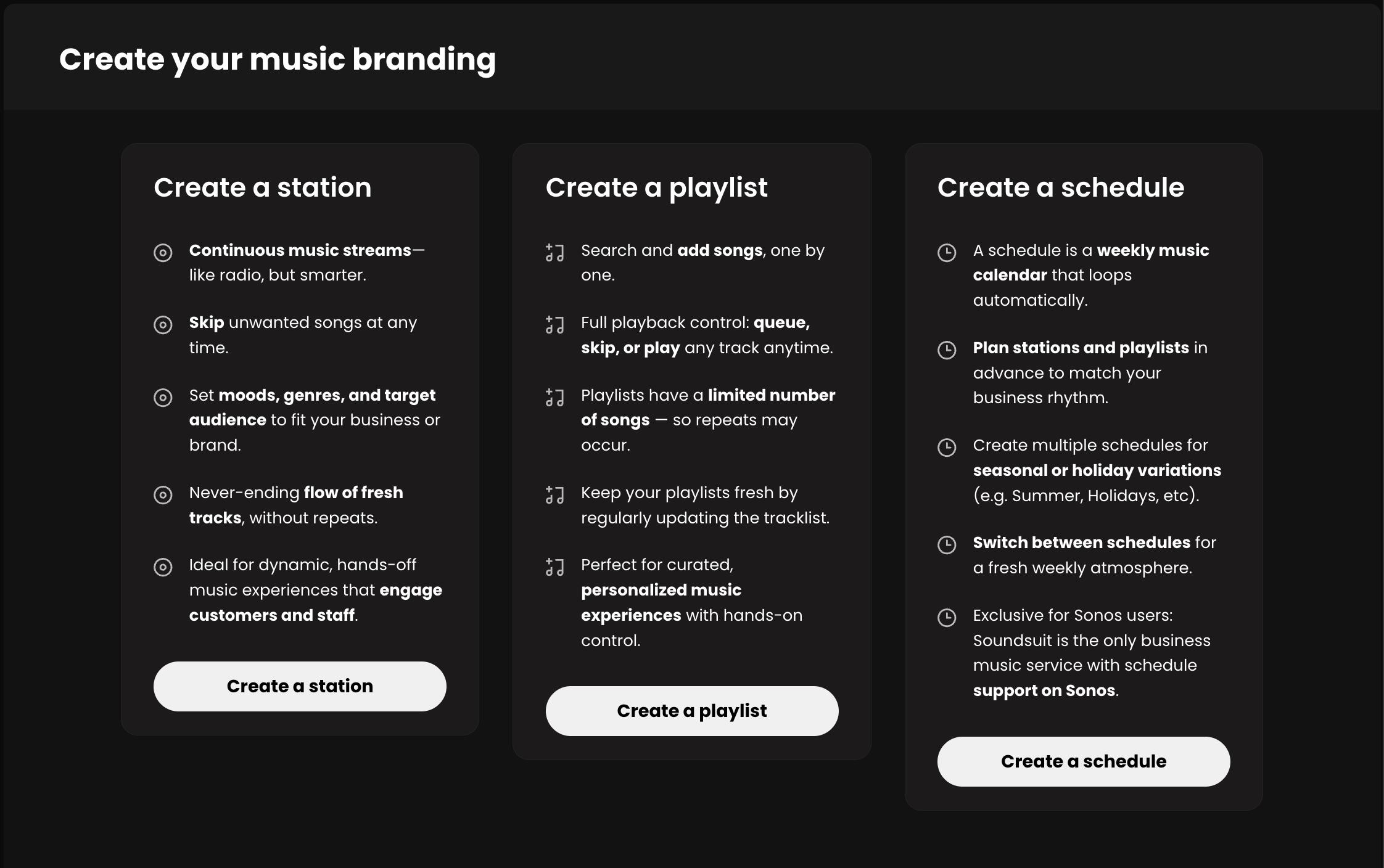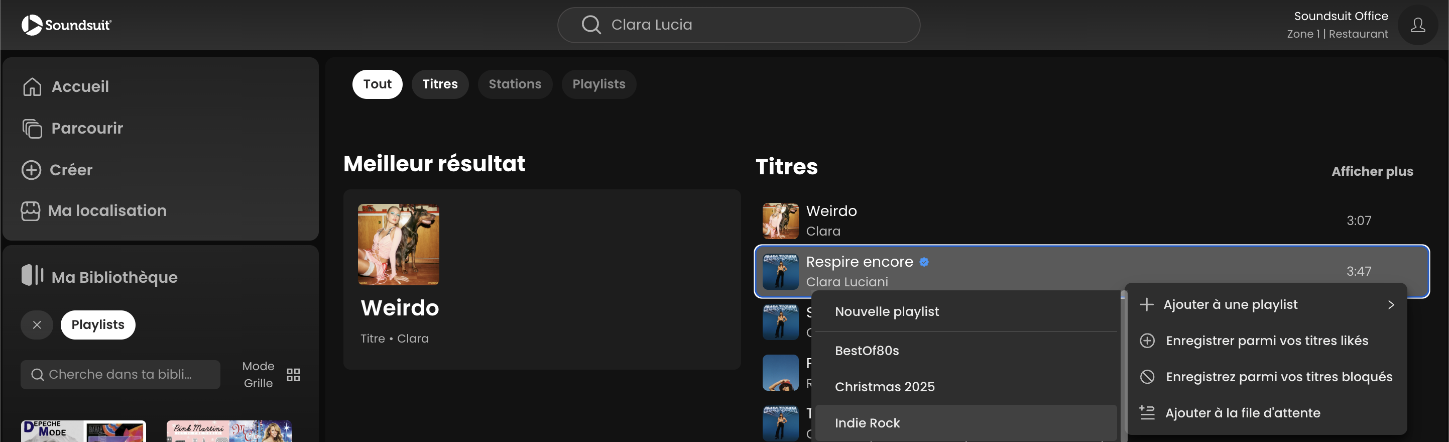 En tant qu'administrateur de marque (multi-sites) ou utilisateur unique (un seul site), chaque utilisateur Soundsuit peut créer sa propre playlist dans l'application Soundsuit.