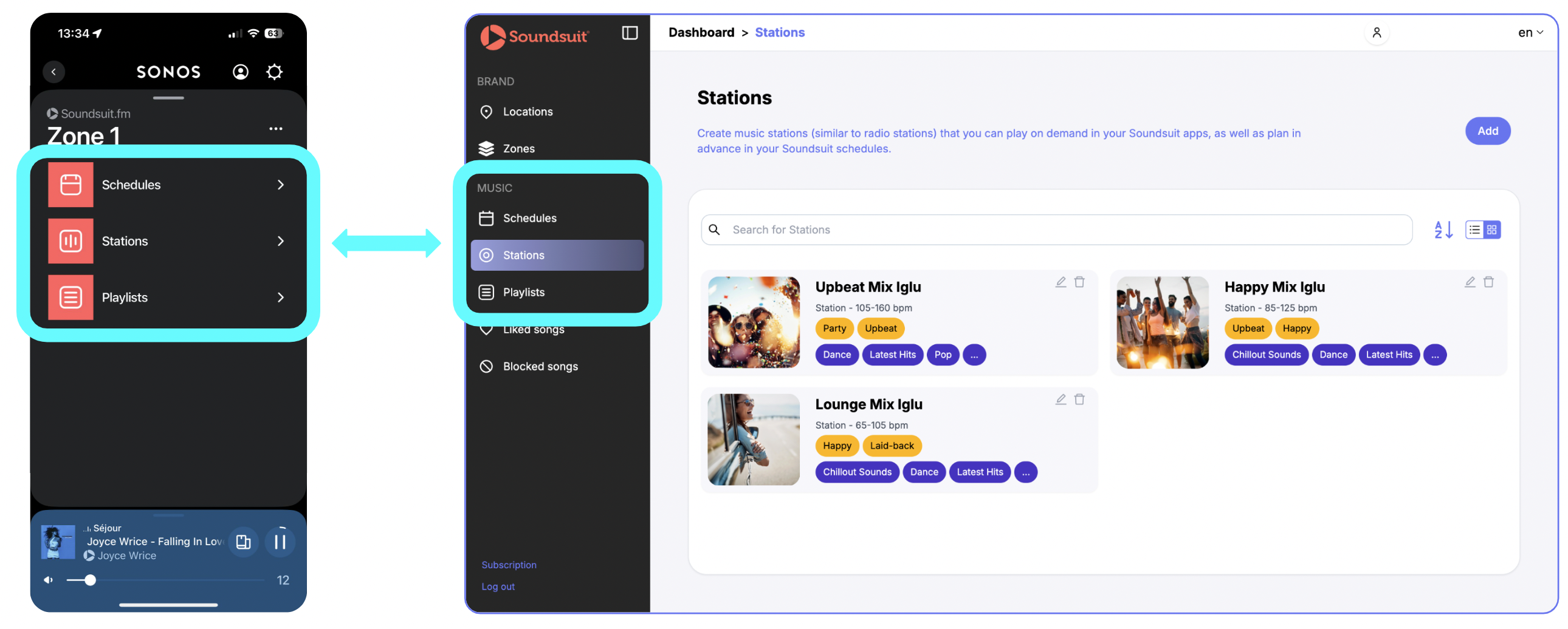 Votre compte Soundsuit est maintenant connecté et activé dans votre app Sonos. Vous retrouvez les menus Soundsuit que vous connaissez et pouvez lancer les Ambiances/Stations Soundsuit de votre choix, ou simplement jouer le schedule Soundsuit de votre choix.